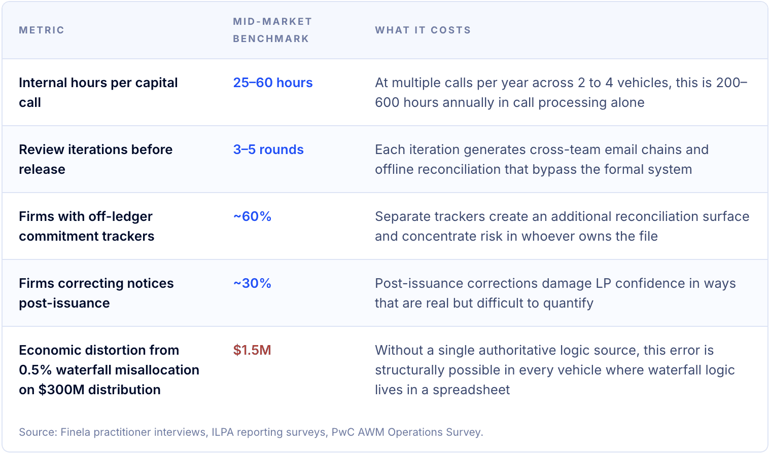 Capital call and distribution processing is one of the most logic-heavy processes in private markets. Each notice integrates staggered closings, fee offsets, recycling provisions, excuse LP mechanics, side letter overrides, and transfer activity. All of it must reconcile precisely before a notice goes out. The observed benchmarks for this process reveal how much invisible cost it carries: