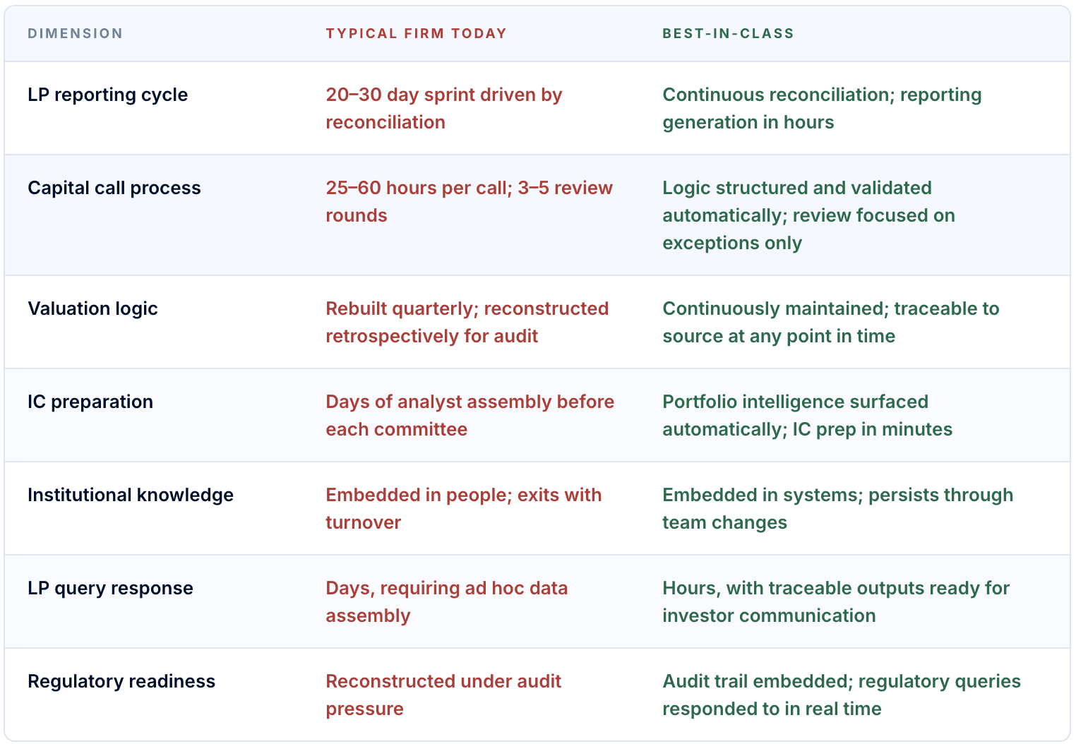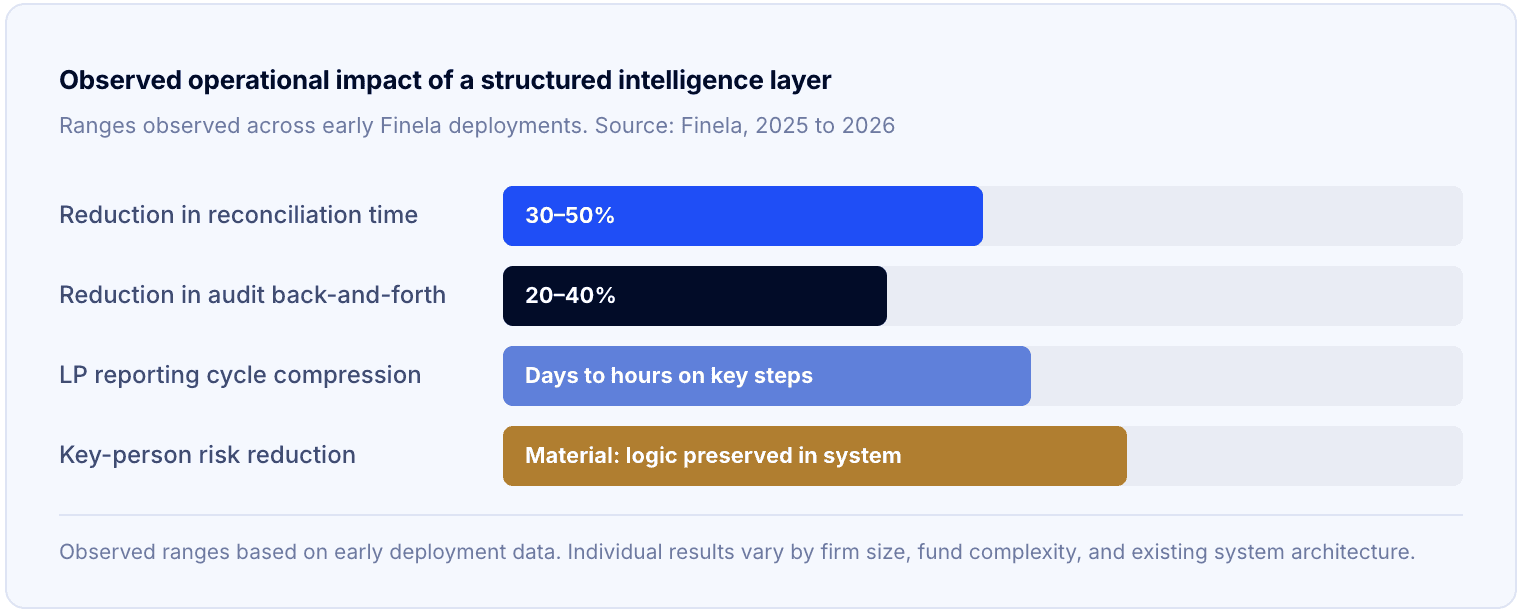 The challenge is not software absence. Most mid-market managers have fund administrators, portfolio management platforms, accounting systems, and business intelligence tools. The challenge is the reasoning layer that sits between them: the interpretation of capital flows, the reconciliation of NAV discrepancies, the translation of side letters, the explanation of variance to auditors and LPs. That layer remains overwhelmingly manual, undocumented, and person-dependent.