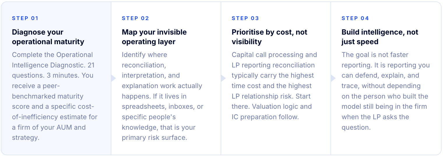 Operational transformation in private markets is not a single project. It is a sequence of decisions, each of which compounds. The single most valuable first step for any leadership function is a calibrated, peer-benchmarked view of where your firm stands today: specifically, the annual cost of current inefficiency in your specific context, by strategy and AUM.