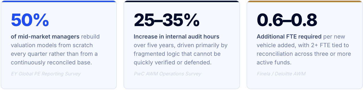 The reconciliation phase is where the structural problem is most visible. Data lives across the administrator's portal, internal Excel models, the portfolio platform, and email-based valuation correspondence. There is no single version of truth at the start of the process. Teams are not doing bad work. They are doing necessary work that should not exist: work that is entirely a function of fragmented data architecture rather than fund complexity.