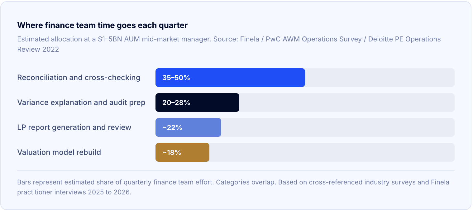 Before a quarterly report goes to investors, most ops and finance teams spend two to five days cross-checking data across systems. Numbers from the administrator, internal models, the valuation memo, and the portfolio management platform rarely align on first pass. The process of making them agree, identifying the source of discrepancy, determining which figure is correct, and updating the relevant models, consumes precisely the days when senior capacity is most needed for higher-value work.