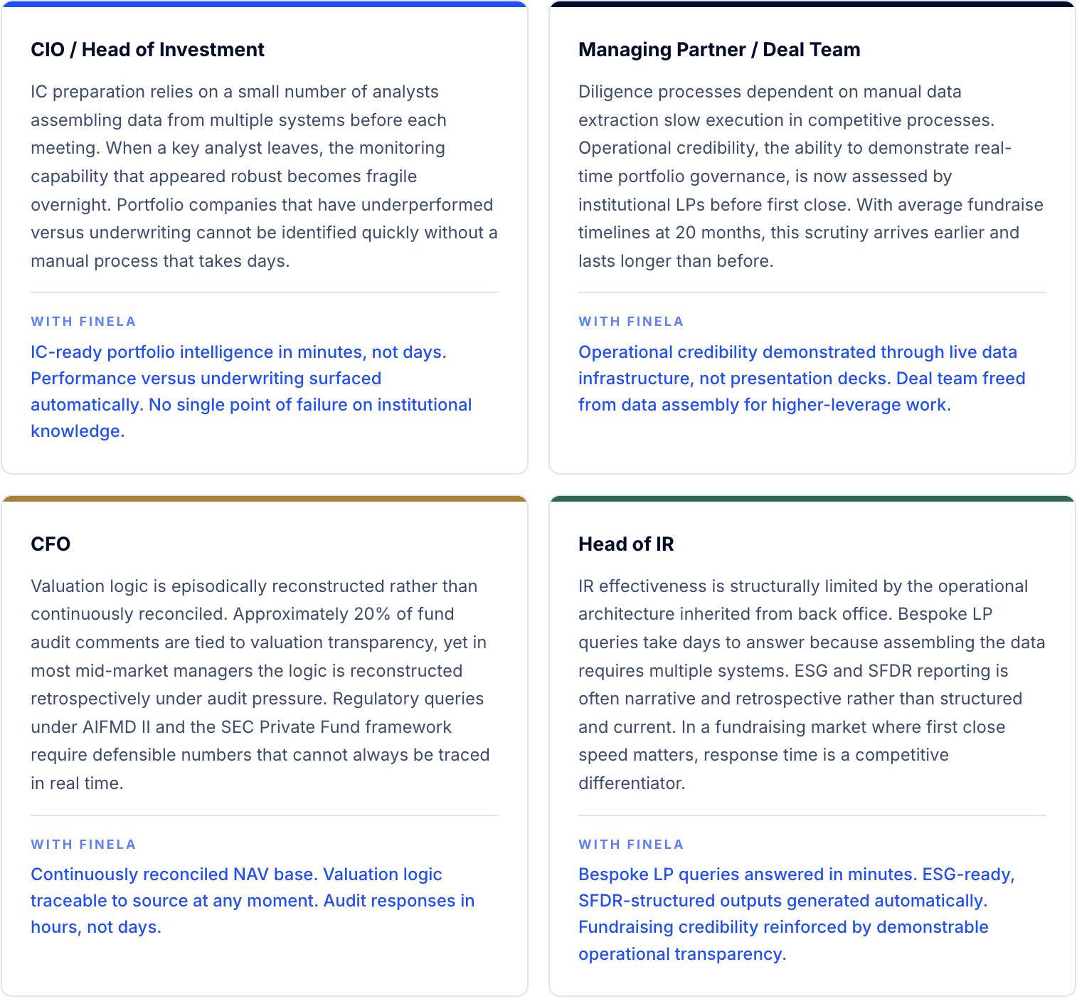 For CIOs and investment team heads, the intelligence gap has a different texture but the same root cause. Portfolio monitoring lags by days or weeks. IC preparations consume disproportionate resource on data assembly rather than insight generation. Variance explanations require ad hoc analysis rather than surfacing automatically.